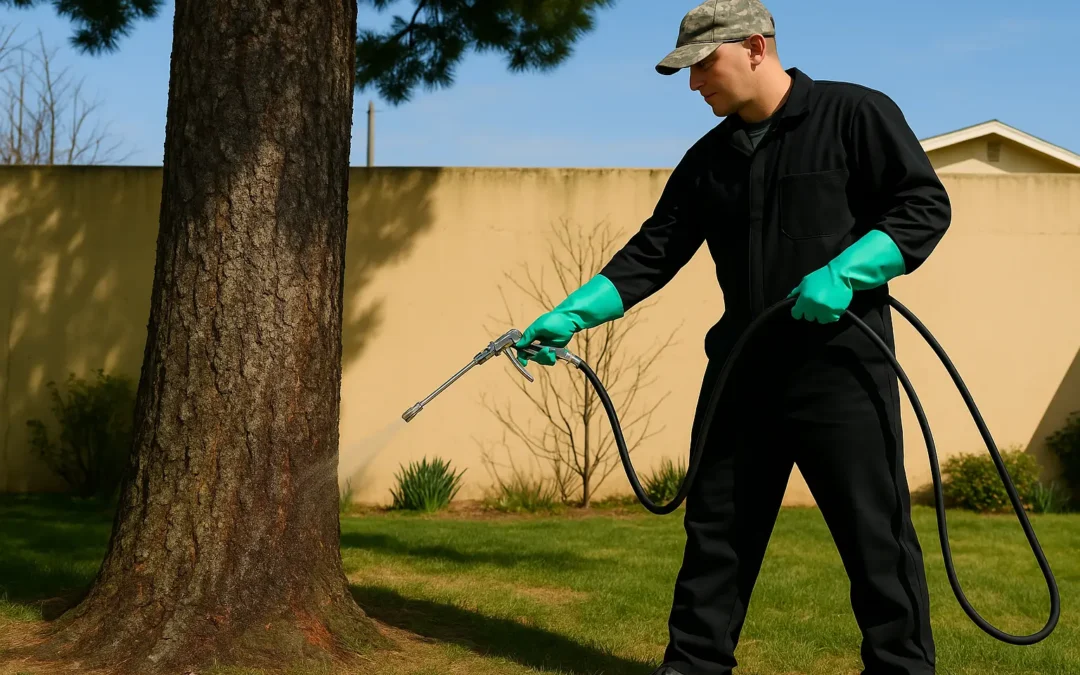 Professional pest control technician spraying pesticide at the base of a tree in a suburban yard with a hose and protective gear.